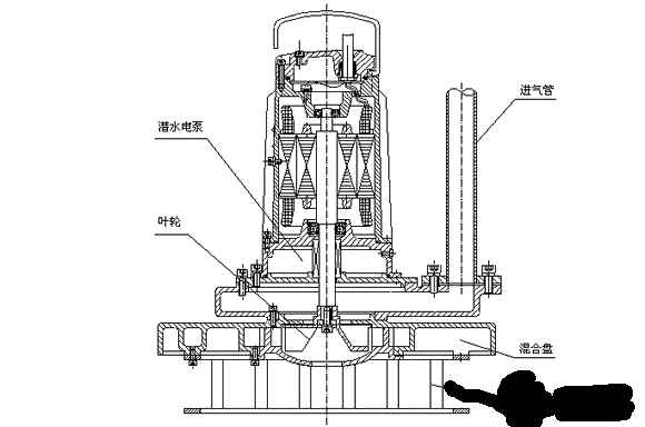 QXB型离心式潜水曝气机为自吸式曝气,直联式结构。旋转的叶轮产生的离心力,在叶轮的进口处开成负压吸入空气和水,利用叶轮的动能在混合室里将一定比例的气水混合,在强大的离心力下,气水二相流沿叶轮的切线方向经流道整流后,向圆周方向扩散,细碎的微小泡充分与水融合,从而达到充氧曝气的效果。适用于各种污水的生化处理工艺中,作为曝气兼搅拌的专用设备。